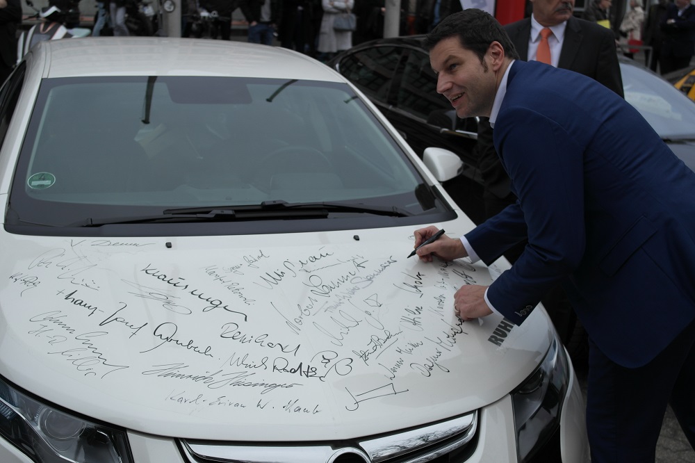 Ab sofort können auch die Studenten und Mitarbeiter der Hochschule Bochum das Angebot von RUHRAUTOe nutzen. Direkt vor dem Haupteingang steht ihnen nun ein rein elektrischer Nissan Leaf zum Sondertarif von 3,25€/h rund um die Uhr zur Verfügung. Am vergangenen Freitag eröffneten UDE-Professor Dr. Ferdinand Dudenhöffer und Drive-CarSharing Geschäftsführer Andreas Allebrod gemeinsam mit dem Bochumer Oberbürgermeister Thomas Eiskirch, Dr. Veit Steinle vom Bundesverkehrsministerium und den HS-Bochum Professoren Dr. Schugt und Dr. Staiger feierlich die Station.